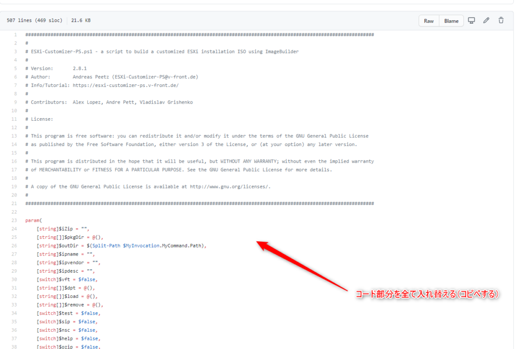 ダウンロードしたESXi-Customizer-PS-v2.6.0.ps1をwindows PowerShell ISEやサクラエディタなどのファイルで編集できる状態にする。